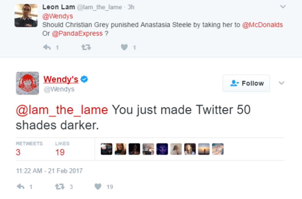 I love Fifty Shades of Grey just as much as the next girl and this tweet had me laughing on the floor. Wendy's didn't miss a beat with this response, completely ignoring the question. The answer, in my opinion, is McDonald's though.