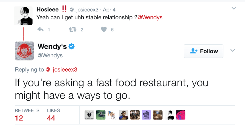 This person asked Wendy's Twitter account if they could get a stable relationship, proving that they have enough problems already. Wendy's replied simply by letting them know they have a ways to go before getting a stable relationship. Maybe stay away from asking fast food restaurants for advice?