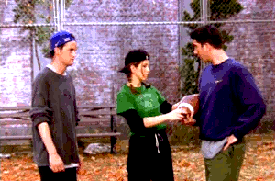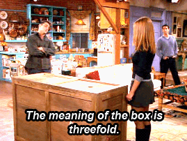 Everyone's favorite bromance is in trouble, y'all. When Chandler falls in love with and eventually kisses Joey's girlfriend, Kathy and then tell him, Joey sentences him to probation on their friendship, which includes spending Thanksgiving in a large box.