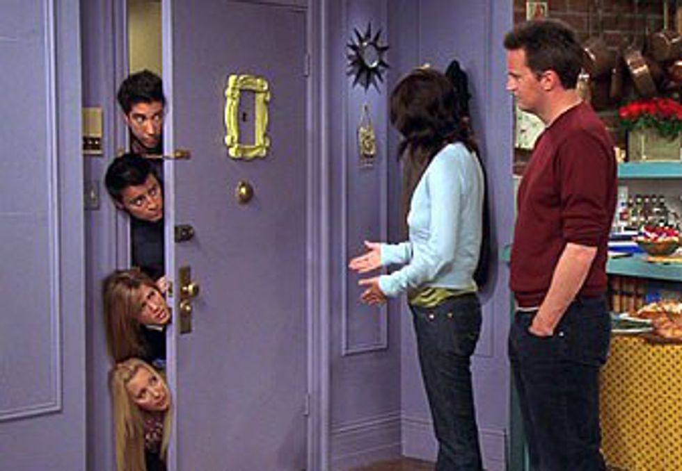 I enjoy the premise of this episode, because Monica, after 10 long seasons, finally stands up for herself and tells her friends she doesn't want to host Thanksgiving at her apartment this year because it's exhausting and stressful. I always felt bad for Monica for always having to host, especially because, even though I love the friends, but they're a needy bunch when it comes to Monica and Thanksgiving. The above image is one of my favorite, because Monica, mad that the group all had excuses for being late, even though they're brats and still insisted she host Thanksgiving, locks them all out of the apartment. Rachel has a great one-liner, they all talk Monica into letting them in, and Joey eats pie off of his shirt, all in true "Friends" fashion. The best part of this episode comes at the end, where Monica and Chandler get a call from the adoption agency and find out there's a birth mother interested in them as parents. It leaves you all warm and fuzzy inside, and it's a great moment.