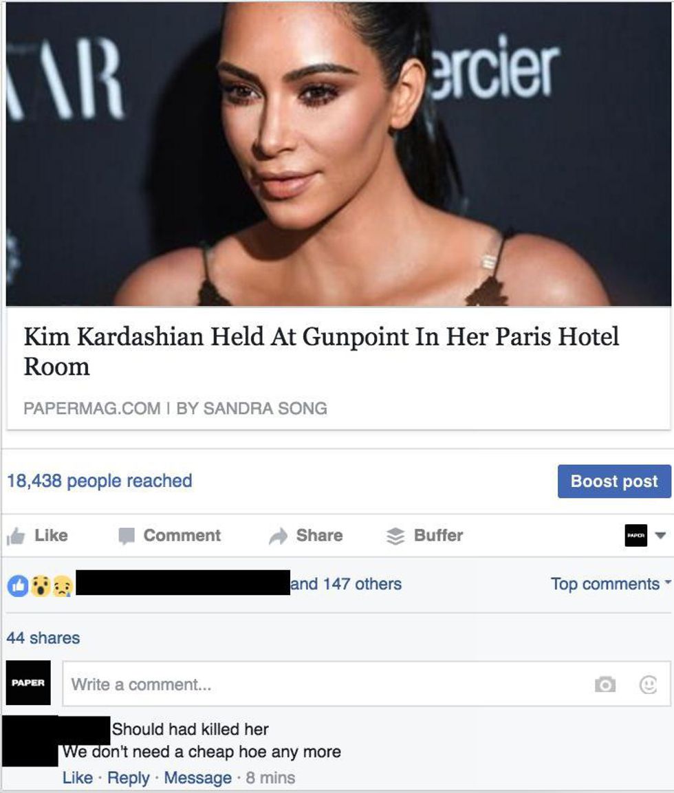 In recent news, Kim Kardashian-West was spotted in Paris as she attended Fashion Week. She was seen posing with her sister, Kourtney Kardashian, with bodyguards nearby. While in her hotel room, Mrs. Kardashian-West was held at gunpoint and robbed of $9 million dollars worth of jewelry. Reports say she was alone when the robbery was going underway. It is said that she was gagged and tied in her bathroom as two men robbed her. When the media received word of this occurrence, the people of social media could not wait to release their thoughts of what happened to the Kardashian.