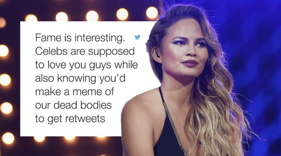 The people of social media were also very active with their thoughts of the incident with everything from death wishes to rape jokes. From those comments, it's like the world has forgotten that Kim isn't just a celebrity, she's a wife, daughter, aunt, mother, and not to forget: human. You'd think when something traumatic happens we, as people, would gather together and help one another, but instead we show little to no sympathy when it comes to celebrities. If you scroll through the comment section of a celebrities social media, you see that there are very positive messages, but also horrible ones as well. Celebrities behind their wealth and fame is a human being and some of the people of this world just don't see it. The dehumanization of celebrities is no different than the degrading of women throughout time. As humans, we are supposed to show respect and kindness to one another. Chrissy Teigen took to Twitter her thoughts on how she felt about the dehumanization among her community.