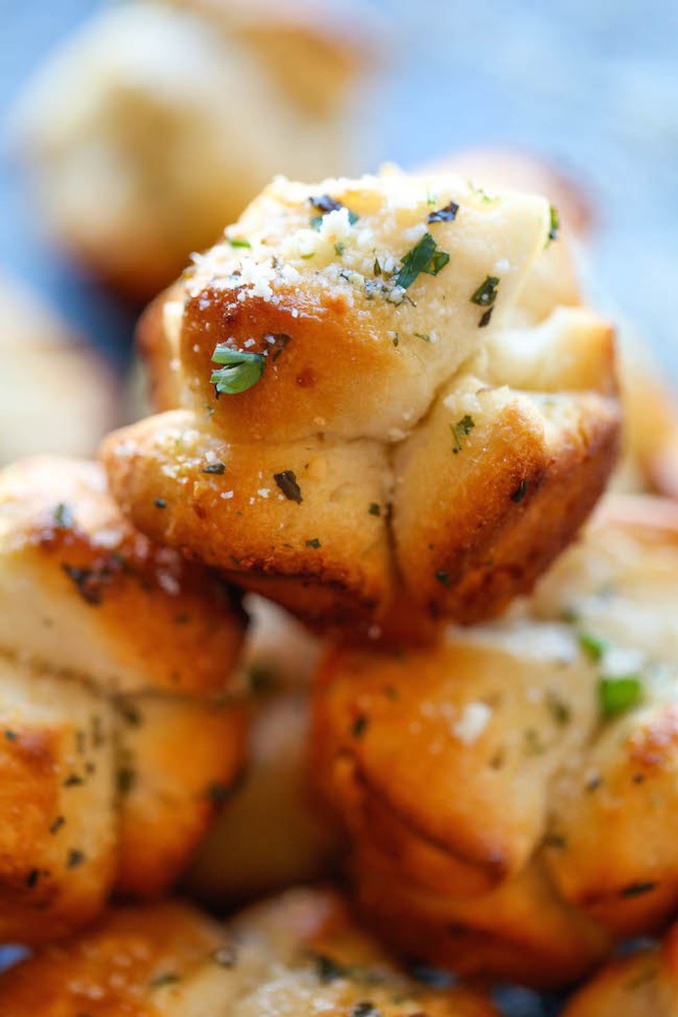 - In a large bowl, whisk together butter, Parmesan, garlic, oregano, basil, parsley and salt, reserving 2 tablespoons; set aside. Stir in biscuit pieces and gently toss to combine.
