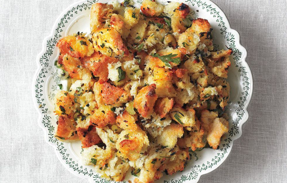 - Meanwhile, melt 3/4 cup butter in a large skillet over medium-high heat; add onions and celery. Stir often until just beginning to brown, about 10 minutes. Add to bowl with bread; stir in herbs, salt, and pepper. Drizzle in 1 1/4 cups broth and toss gently. Let cool.