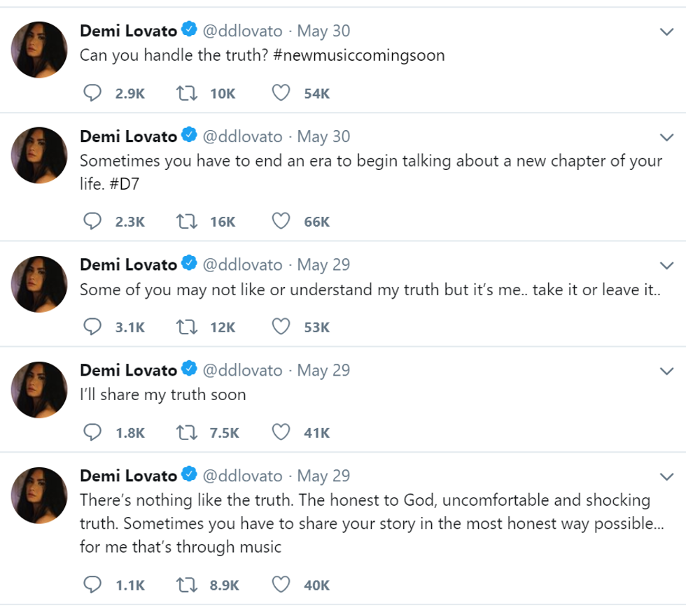 At the end of May, Lovato teased her newest music to fans, saying of her upcoming seventh album, "Some of you may not like or understand my truth but it's me... take it or leave it.." Upon the release of "Sober," Demi captioned her social media posts: "My truth... #sober out now."