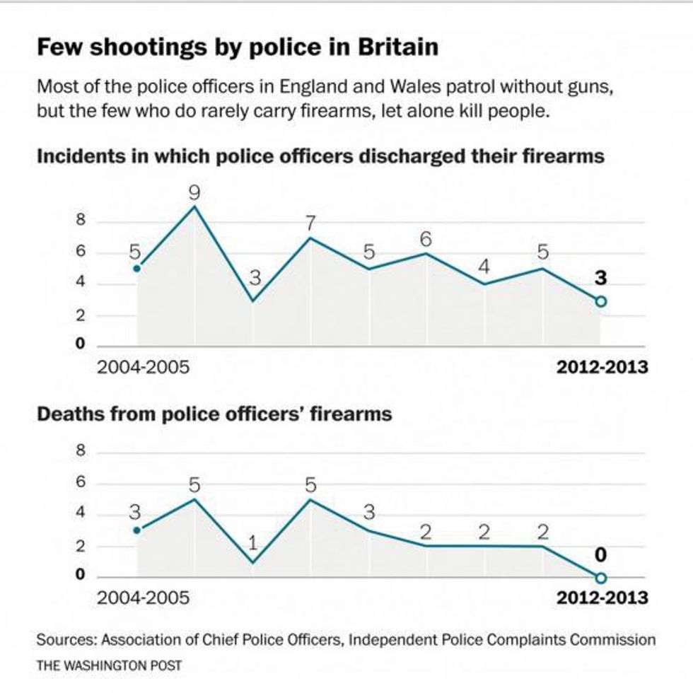 In Britain, the majority of cops do not carry guns; a British police officer must work for years and join an elite unit to be eligible to carry a firearm. By June 2015, British police had fatally shot only two people in three years. Phil Palmer, who had been a British policeman for 15 years, spent a year in the United States teaching and working with New York police officers.