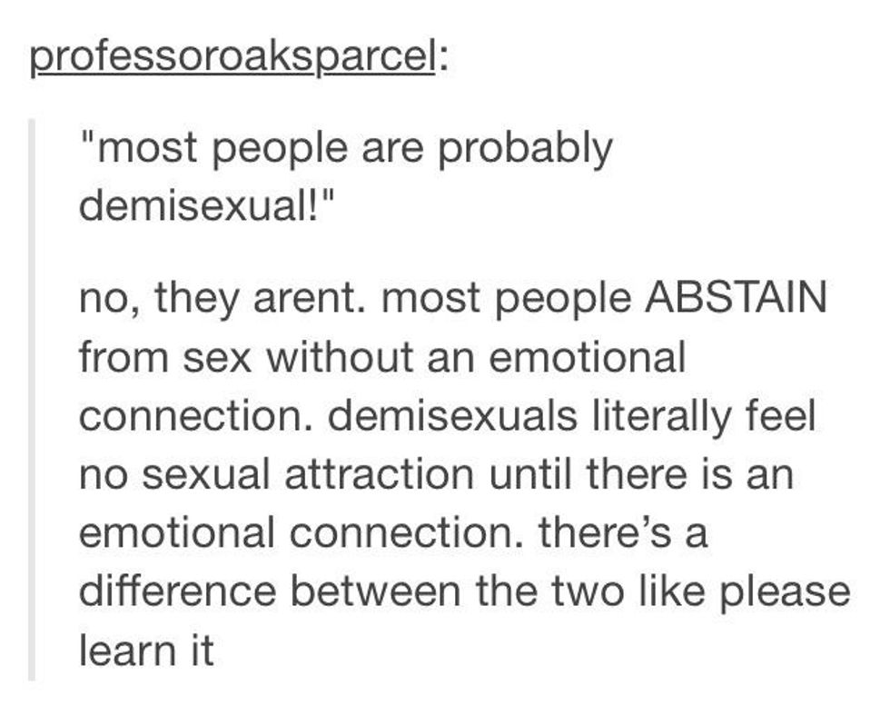 Though there are certainly key indicators of a demisexuality identity, like a lack of primary attraction, not all demisexuals are the same. Not all behave or regard sex and relationships in the ways I have outlined in this list. There is difference from demisexual to demisexual, and same goes for others on the asexual scale. Asexuals are not amoebas or plants, they are humans, and they can be romantically and sexually attracted to people. It just might be extremely rare. Even if they don't experience those attractions, it is not helpful to equate them to non-human entities. Humans aren't defined as human only because of an existence of sexual and romantic attraction. Demisexuals are not weirdos or celibate, and they can develop sexual and romantic attraction at different rates or different frequencies. What qualifies as a "strong emotional bond" varies person to person. People can have instances where they act outside of their sexual identity or have "exceptions." Behavior does not define sexuality, and sexual identities do not restrict the person to a certain set of behaviors. It's all about what label the person feels most comfortable using. It should never be about how "well" they perform the textbook definition of their sexuality.