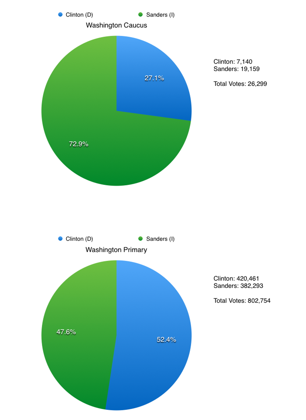 In the 2016 Washington caucus, which determines how the delegates will be distributed, Bernie Sanders won in a landslide. However, only 26,299 people participated in the caucus. In the Washington primary, 802,754 people voted.