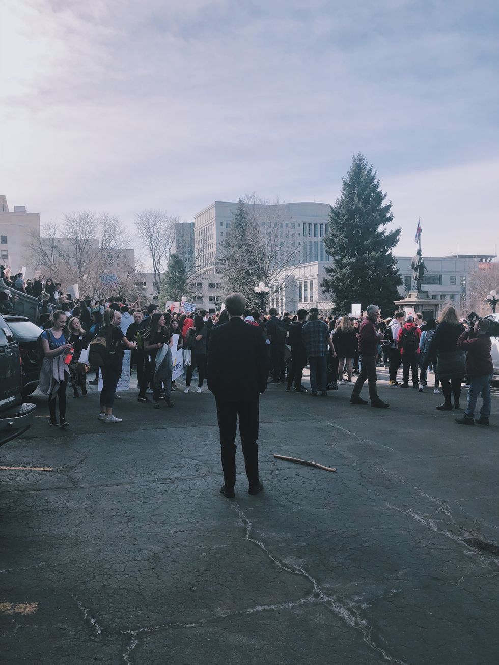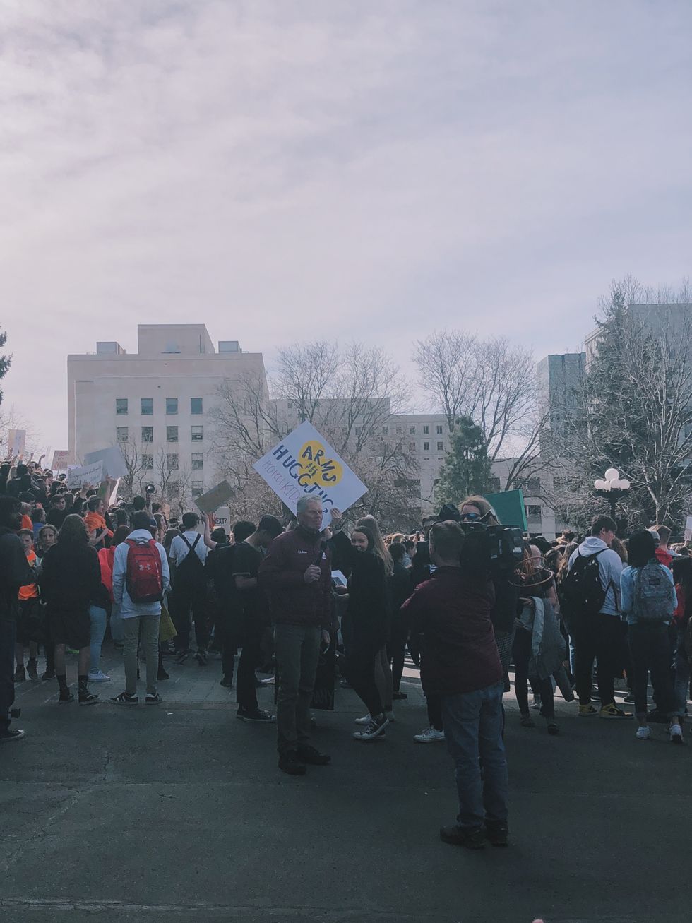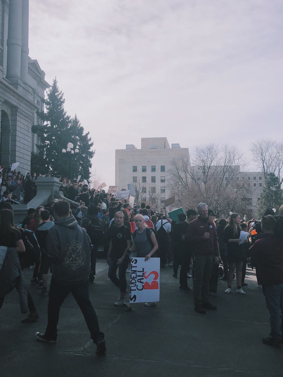 Upon arrival, it was clear my parents were wrong. The front steps of the building were packed with students holding signs, teachers and state patrol officers monitoring everything and countless reporters doing interviews. Busses were lined up on the streets, waiting to take students back to school. Occasionally a chant would break out or a student would give a speech about what they believe needs to change. It was unlike everything I'd ever seen.