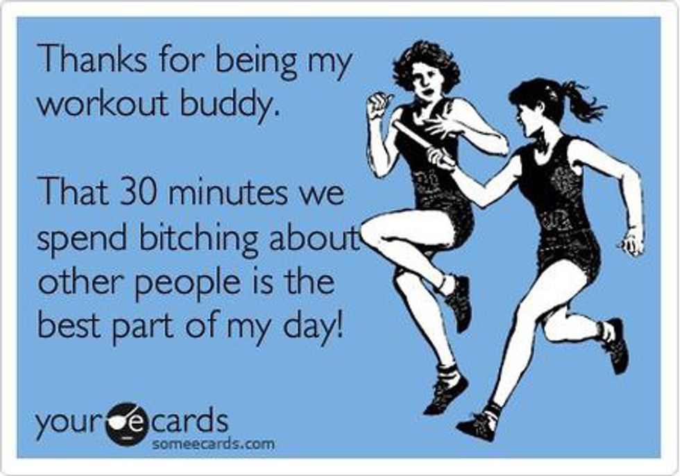 Yes, you have someone to die with while you're on that treadmill for what seems like hours of sweating and heavy breathing. Yet, when you are loosing focus due to gossiping, talking about issues at work, or simply catching up,