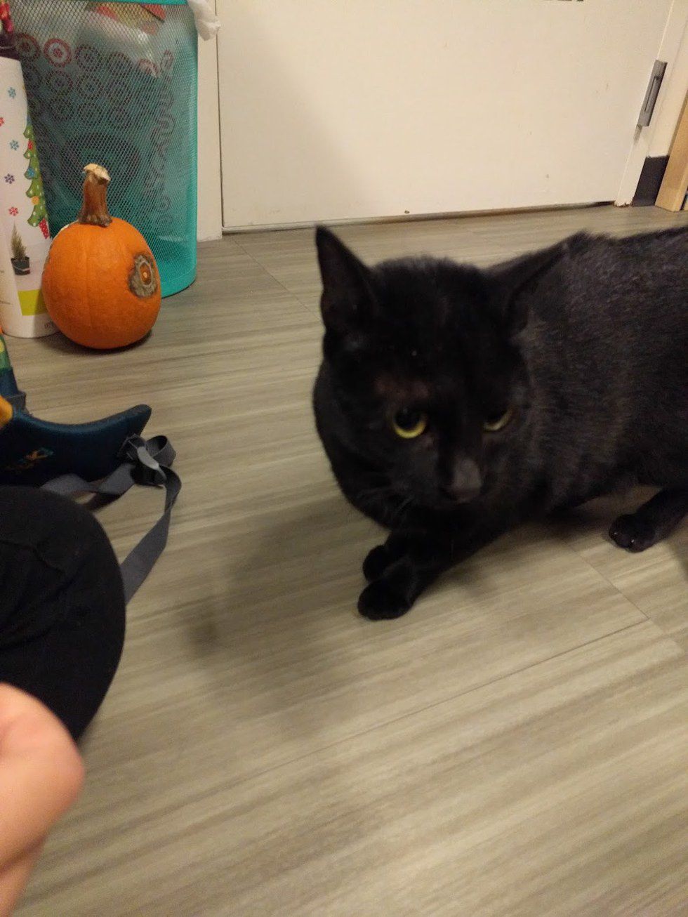 I stole a cat. Please do not tell any of the RAs or the RD in Wall. His name is Wednesday and I lured him in with treats. He will eventually love me and then I will invite everyone (except the RA's) into my dorm to pet him.