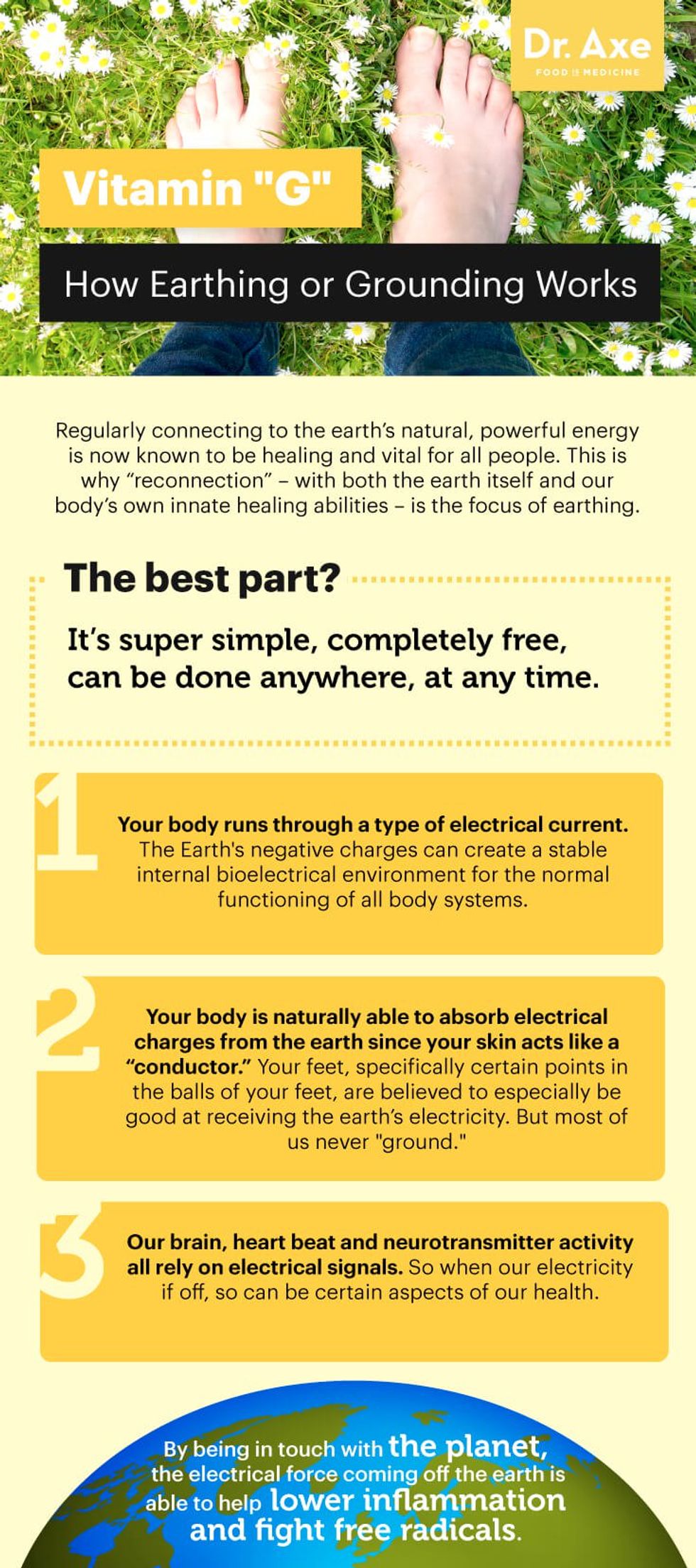 As humans, we are all connected to the Earth. By getting some fresh air and putting your bare feet on the ground at the beach or in grass, you can absorb negative ions that are released into the air to help lower your blood pressure and feel an elevation in mood and sense of calm.