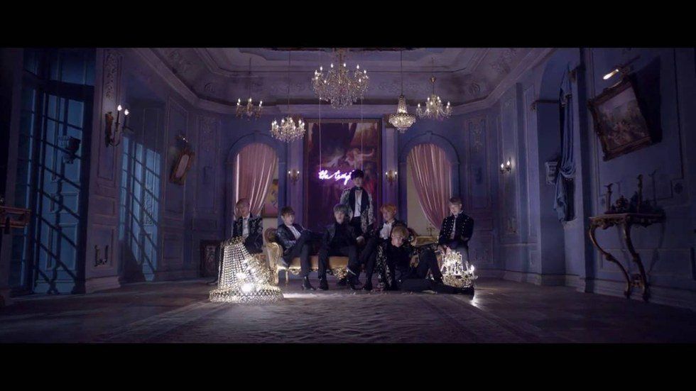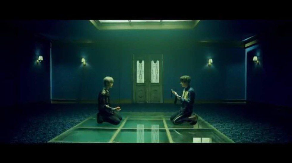 In the start of the video when the 7 boys are walking into the foyer there are statues standing around the room on display. With one minor glance, there are a couple of things that can go quite unnoticed among these marble figures. 1. There are 6 statues and an empty pillar. A statue for each boy in the band, except for one. This seems to be an interesting issue to think upon throughout the video because 2. Of the 6 that are on display, 5 are made of white marble, but one is made of black. Now this may not seem to be like much, but take in mind after watching this video and breaking down the dual concepts that they are trying to represent, this is no accident. One boy out of 7 is purely fallen and has been claimed by the dark side while the rest are slowly reaching there, but one boy of this remaining 6 is quickly on his way of getting his own statue of fallen imagery.