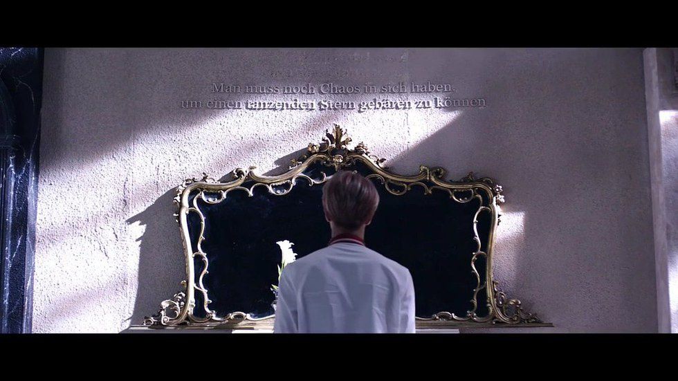 Yet another simple line, written in German, that is carved above the only mirror that is shown in the entire MV. These words and mirror are seen near the end when Jin walks up to it, looking at himself after he has sealed his fate by kissing the statue of a fallen angel. He sees the crack of what was pure and now begins to see the side of him that he has opened up. This second world; a world of chaos and uncertainty. And clearly the line by Nietzsche tells us that to hold something that is chaotic, like a burning and dancing star, we too need to have some within ourselves. But to even have some chaos in our lives we need to know how to balance it so that we don’t and crack completely. There is hope to have an equal of both sides and even hope of gaining redemption after having stepping into the darkness. No matter what, the journey starts within oneself.