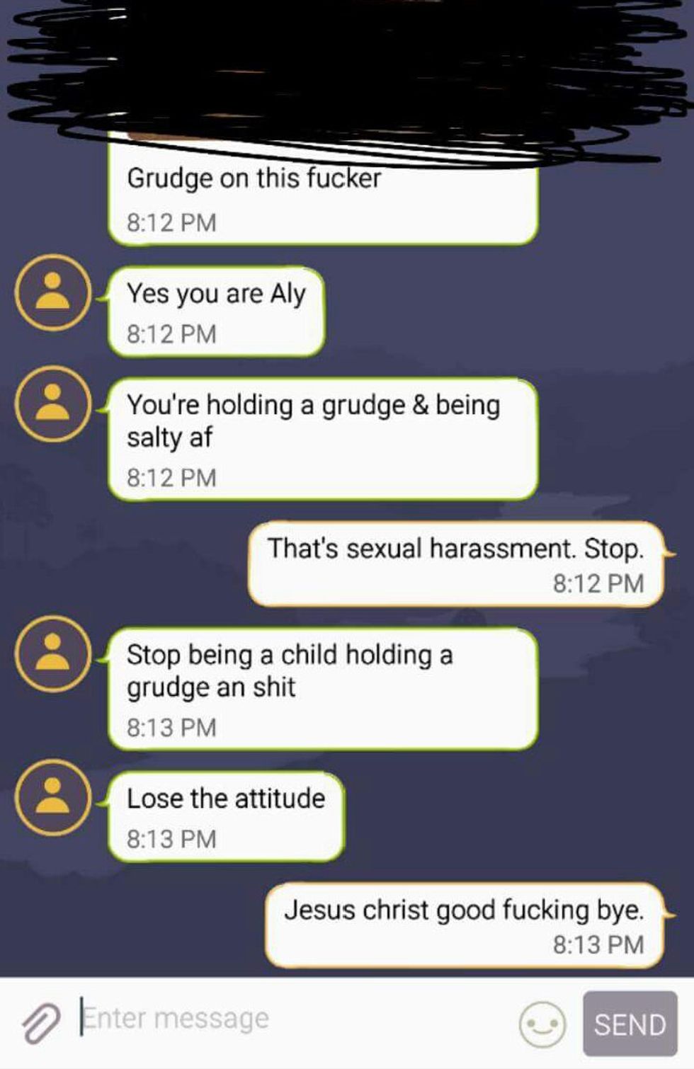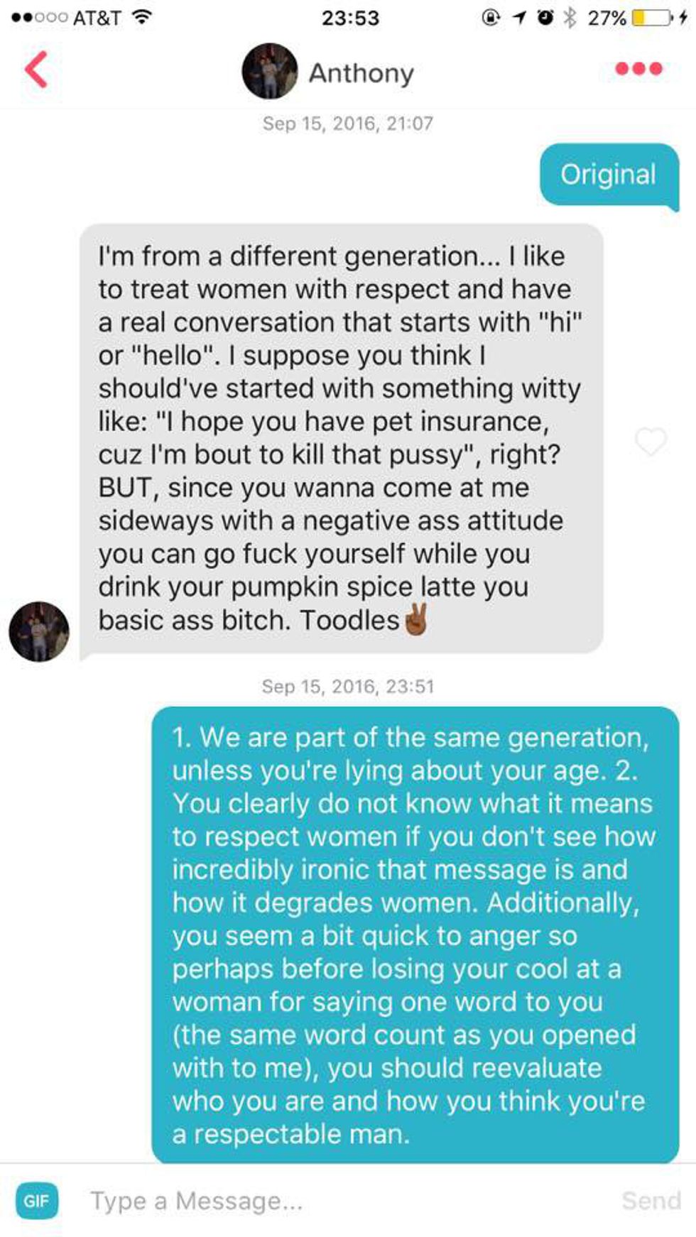 "I have never considered posting anything of my own like this on Facebook until now. He opened with "hi" and the rest you can read. I am sickened by the language, the blatant misogyny, along with his general disposition. Please understand that this is why feminism exists. Because I said one sarcastic word, he defaced women as an entire group. I am disgusted."