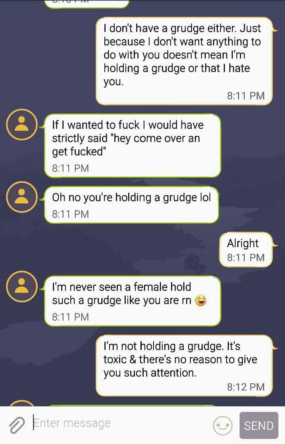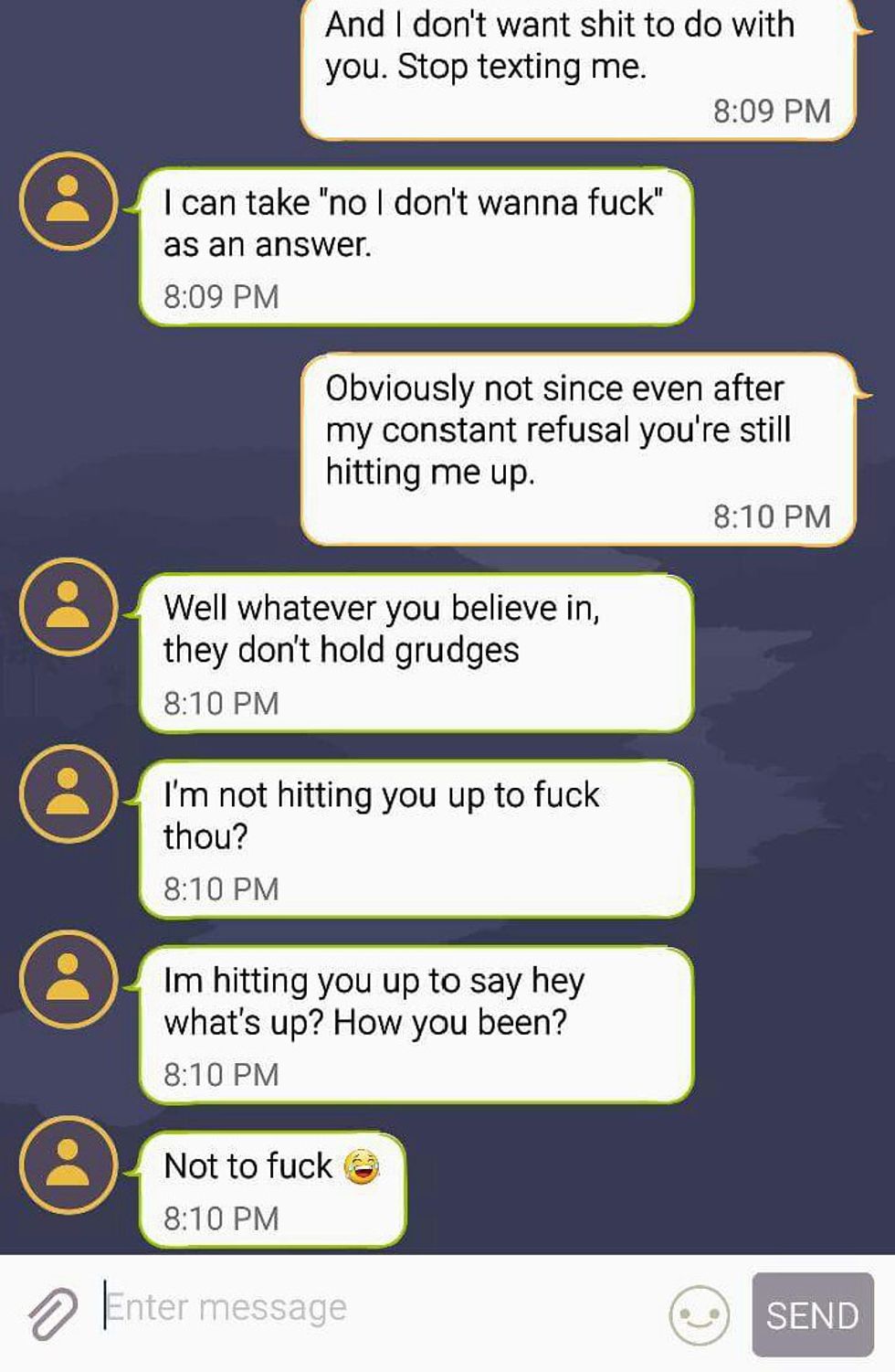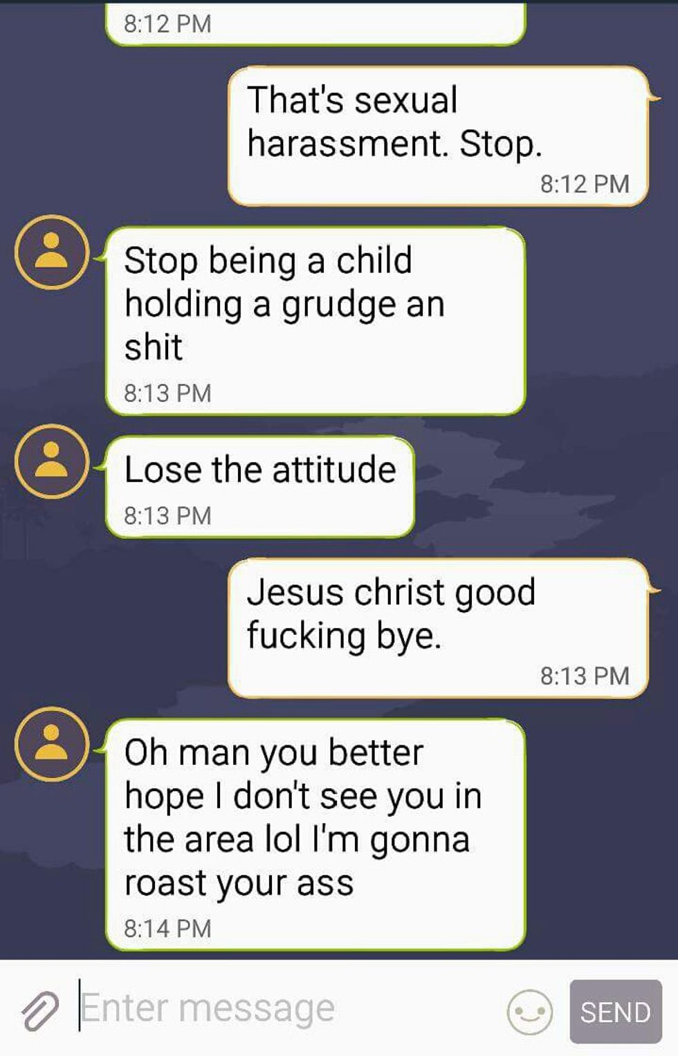 I have heard of men acting like this towards women online. They hide behind their phone screens as their fragile masculinity crumbles beneath them. Since my overall experience with Tinder has been pleasant (that might be a slight overkill, but let's roll with it), it never truly crossed my mind that it could happen to me. What I truly did not expect was the fourth messenger. I got his first message around 3 o'clock in the morning. Unfortunately, I can't share the original messages on here because I un-matched him in order to get him to stop messaging me once this whole fiasco was over. Tinder has a feature that shows how far away from someone you are. I just so happened to be "less than a mile away" from him. When we started talking. he seemed nice. He happened to be a bouncer at a bar that I used to go to regularly with friends, he graduated from my high school's rival, and he lives in the same apartment complex as I do.... Right across the street. One night, he kept calling me over and over again. I work at a bar downtown and was at work until 4 in the morning when I finally checked my phone to see that he had called half a dozen times. When I listened to my voicemail, he had threatened to break into my apartment and "let my dogs out on the street" if I didn't call him back. I rushed home in tears thinking I would find my sweet little dogs roaming the streets of Greenwood. Fortunately, I never told him what apartment I live in. All he knew was the building number - although looking back, giving him that was a death wish since it is not hard to figure out what home is mine based on just looking at it. I woke up the next morning to my phone ringing again. I picked up to hear him apologizing profusely about his "drunk behavior" the night before. Keep in mind - I [still] have never met this guy before. I hung up after telling him I didn't want anything to do with him. I put my phone down and got ready for work thinking that my Tinder nightmare was over. A few days later, it began again. The following texts are from him: