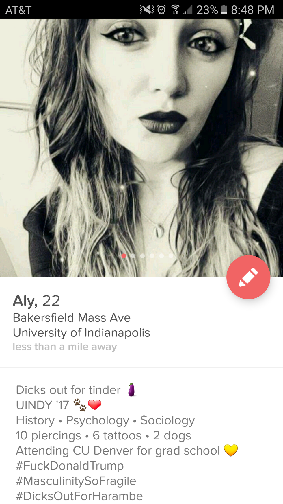 I like to have fun, joke around, and poke at the fragility of masculinity in today's society. I also like to rock the dark lipstick and look flame when I go out. When I first downloaded Tinder, I asked my guy friends tell me what to write in my bio to attract "Mr. Right".