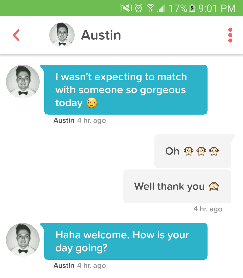 I have a wide variety of friends who all knew exactly what I was looking for in creating the perfect TInderella appearance. And they were right! After a few glasses of wine and some "right swiping" action, I got my first message. A cheesy pickup line, kind of expected that. But nonetheless, nothing sexual. No unsolicited dick pics, so we're off to a good start! The second message was much expected as well. "DTF?" He wrote. The third guy is a sweetheart. Totally not what I was expecting. He did not immediately hit me up wanting to "Netflix and Chill", there was no corny pickup line involved, just a genuine compliment. So far, I've hit all three of the standard Tinder men. It's been exactly what I expected.