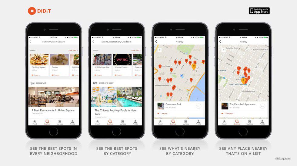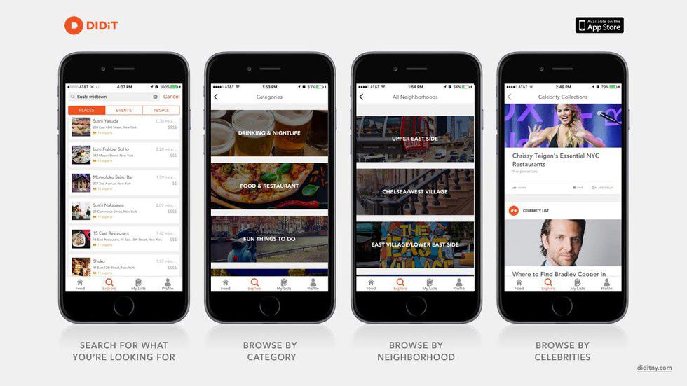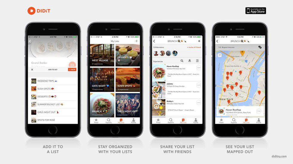 DIDiT is a great app because it helps users figure out where to go for anything that they're interested in doing on that day. Whether it's finding brunch spots, rooftop bars, or following the footsteps of celebrities, the app has lists that fit all of those activities and more. I remember seeing a list of desserts and realizing that instead of going on Yelp, having to ask my friends who live in the city for recommendations, or having to find all of these individual places myself, I could just use the DIDiT app and have an entire list of great places in a few seconds. I was instantly hooked.