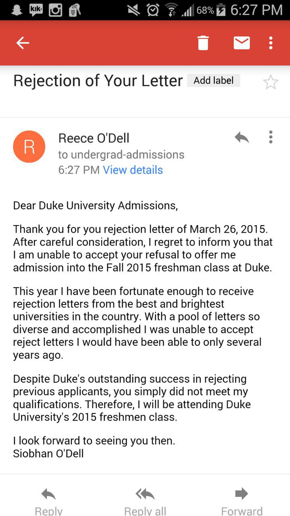 The Honors director at Francis Marion University put all of his rejection letters on a HUGE display outside of his office. He wrote in red pen all of his commentary and sometimes just large red curse words on each letter... be right back...going to buy a frame for mine.