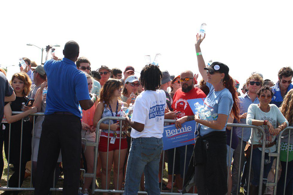 Bernie's stadium rallies may feature the same food options, but at least at this outdoor rally in the Florida heat, volunteers paraded in with water bottles and began passing them out to the crowd. "Pass it down! Pass it down!"