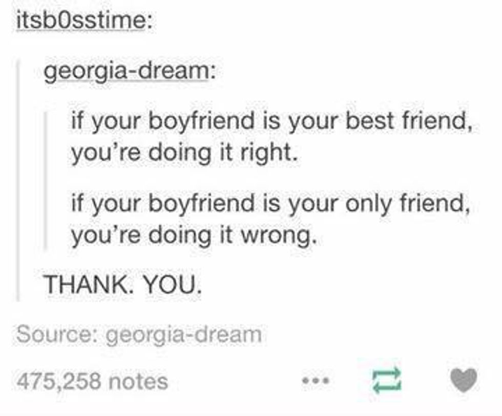 It took me a minute to process what this said. I've been in a situation before where my boyfriend (now ex) was my only "friend." But now, I'm in the situation where my boyfriend (current) is my best friend. Having someone who you can trust and be around all the time is the best feeling in the world, but it can lead to disaster if it's handled the wrong way.