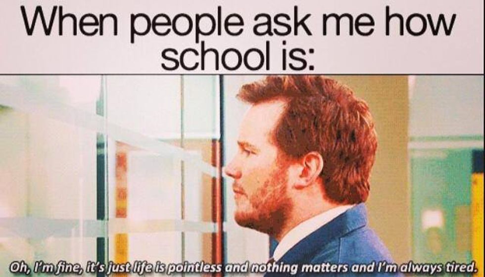 The difference between May in high school and in college is most notably determined by the lack of finals high school students have to drown in. A final is the cumulative final exam college courses assign their students to see how well a student has retained the knowledge learned in class. A hard final requires extensive studying, and sometimes that means pulling an all-nighter. For some, a good final could remind one why they should marry rich, or how the struggle you're in today is developing the strength you need for tomorrow.