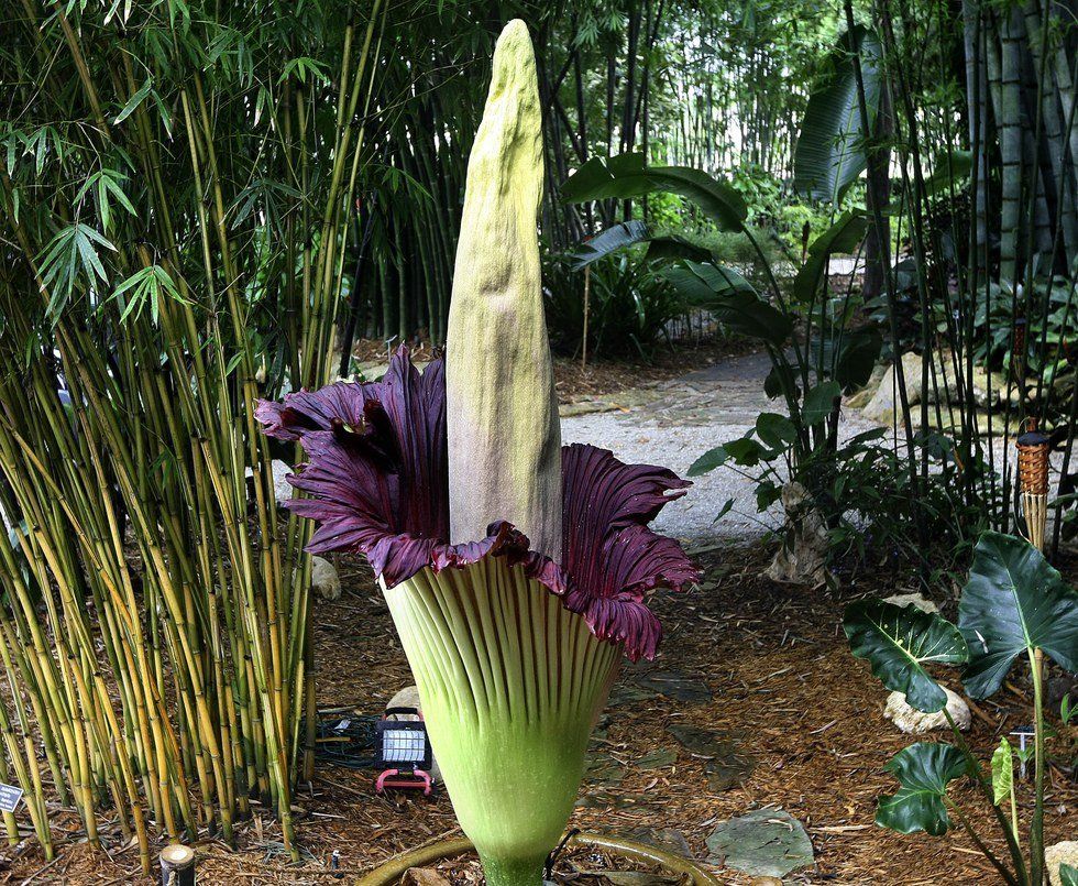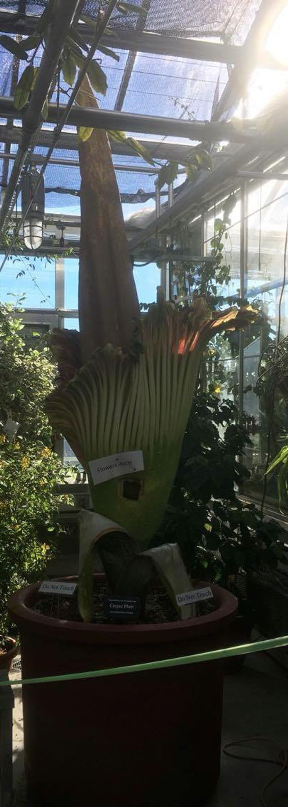 Today, I met my first corpse flower. Nicknamed "Morphy," this flower stands at 7 feet tall and is known and named for its terrible odor. This flower is a rare species with only several in the world to be found. The reason why the corpse flower at Dartmouth's greenhouse has received so much attention in the past couple days, is because it is in bloom! A corpse flower bloom is a momentous occasion that happens on average once every six years or even longer, depending on the plant. While the plant is tall now, the appendage sticking out of its center will soon collapse as the plant bloom period passes.