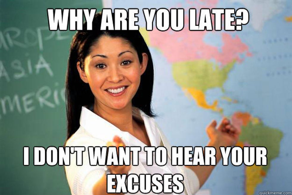 Whether it's late to class or to you guys' hangout. Don't you hate that text received at your scheduled meetup time, "I'm 2 min away!" or "I'm OMW!" (when you know they probably just got out of bed)? The best solution is honestly to set the "meetup time" 30 min earlier than when you actually want them to show up!