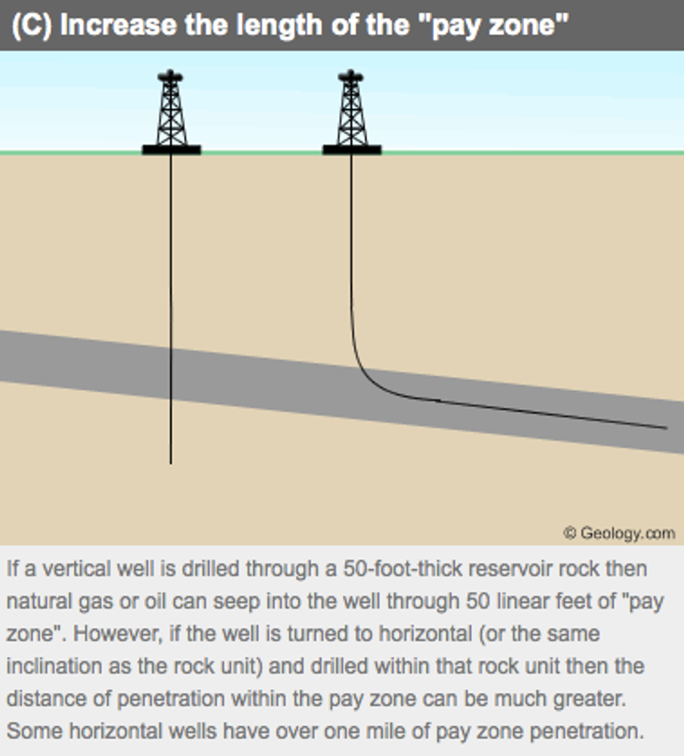 Directional drilling, when combined with hydraulic fracking, can also stimulate the source, potentially reaping more oil and gas from the same source that would not produce as much oil when drilled vertically. This method of drilling can increase productivity in more than one way. For example, reaching a 50 foot deep well vertically means drilling 50 feet deep, whereas drilling this same 50 foot well at an angle increases the ‘pay zone’, or the amount of oil the well can access. Directional drilling also uses the maximum number of fissures, therefore draining more oil or gas. This method does not only increase production, but can reduce emissions by drilling in multiple directions with only the water, energy, and emissions of one drilling site.
