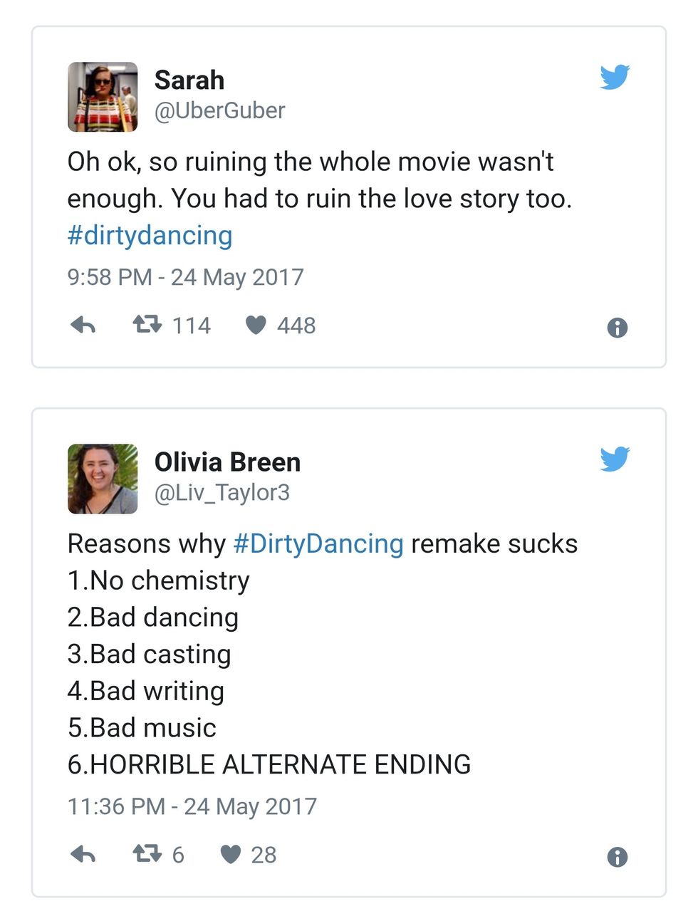 Everyone should have done their research before bashing a cast that just did what every one else did. If I am being honest, I think it was bound to be remade again, this August will be the 30th reunion of Dirty Dancing 1987. All and all, the 2017 remake was actually pretty good. Abigail Breslin (Baby) and Colt Prattes (Johnny) had a lot of past performances to live up to, the whole cast did, but they really took care of this 1980's classic. As a die-hard fan of the original movie and cast, I enjoyed this remake very much and think it deserves a little more praise for taking on a well-thought out story.