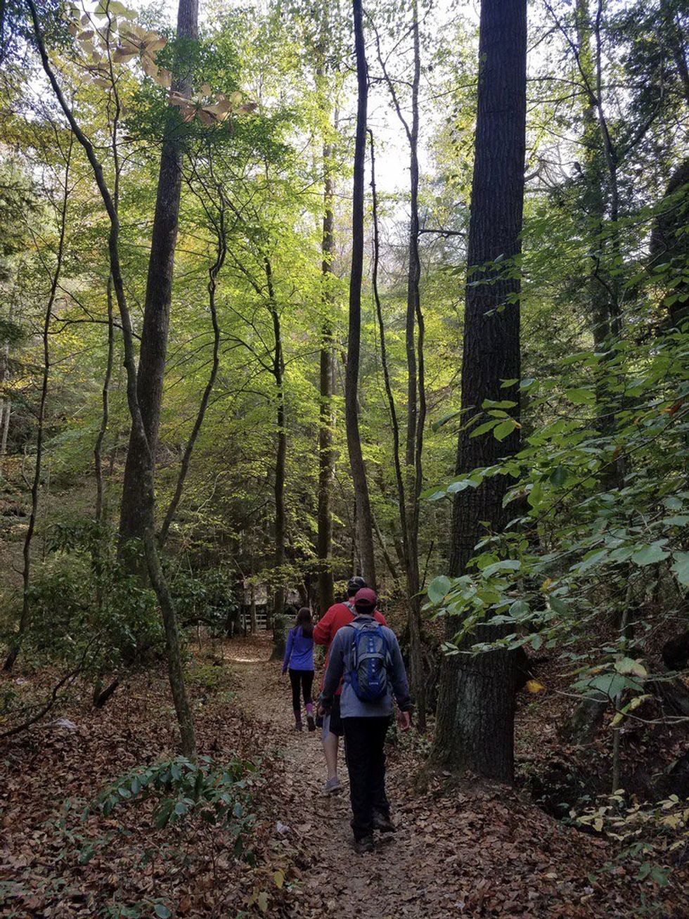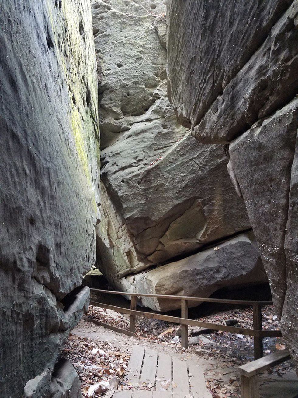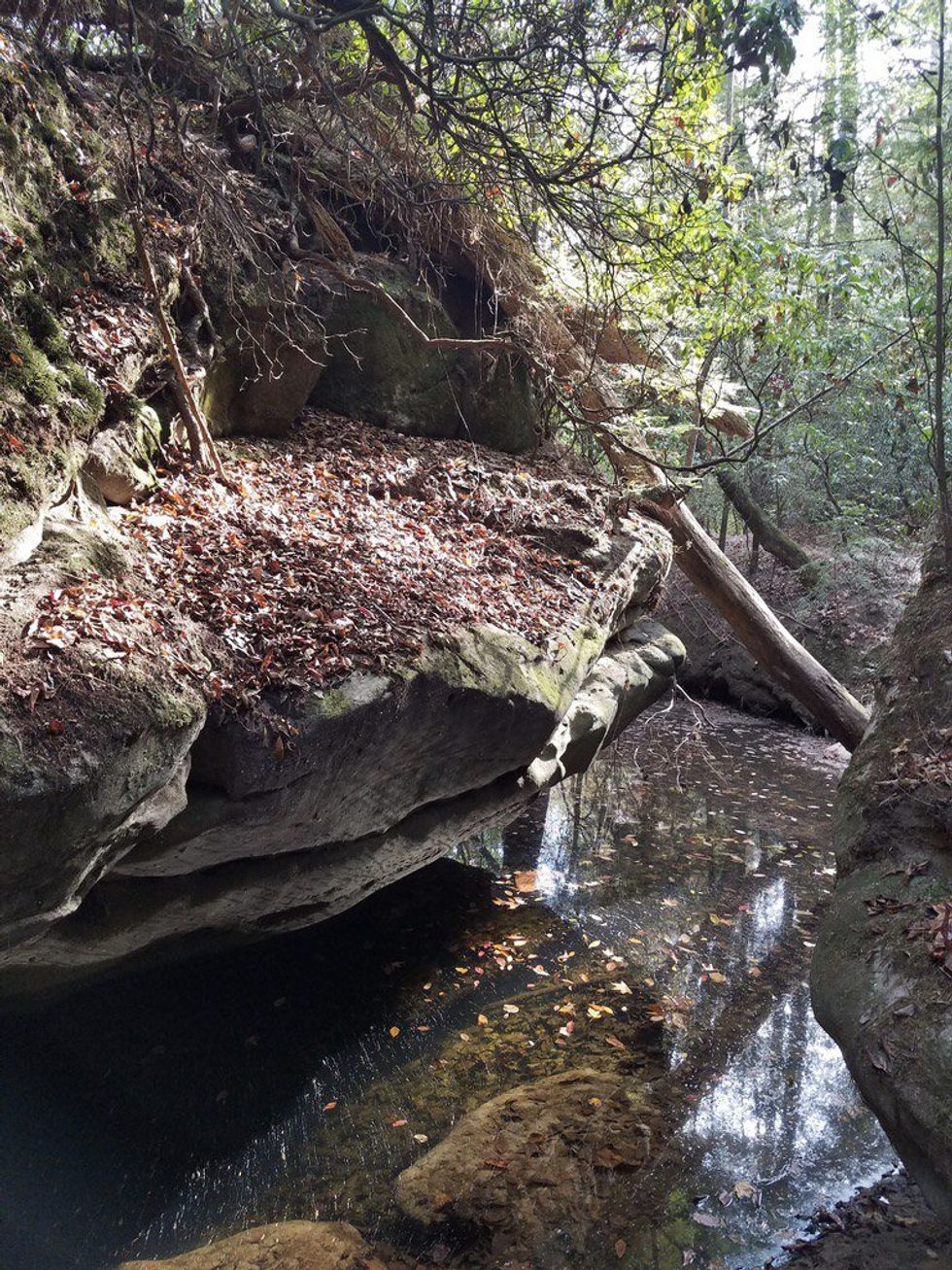 When you arrive at Dismals Canyon, you walk down a short trail to this adorable cabin with an amazing deck to check in. You fill out some basic information and pay, then you get your map and head out. The trail is basically a loop; you end that trail where you start the trail. The caves are gorgeous and sometimes frightening. The trees are incredibly high in the air, towering over all of the visitors. There is a creek that runs down the middle of the trail that you have to cross over a few times. You can either cross the creek using suspension bridges or on large concrete stepping stones.