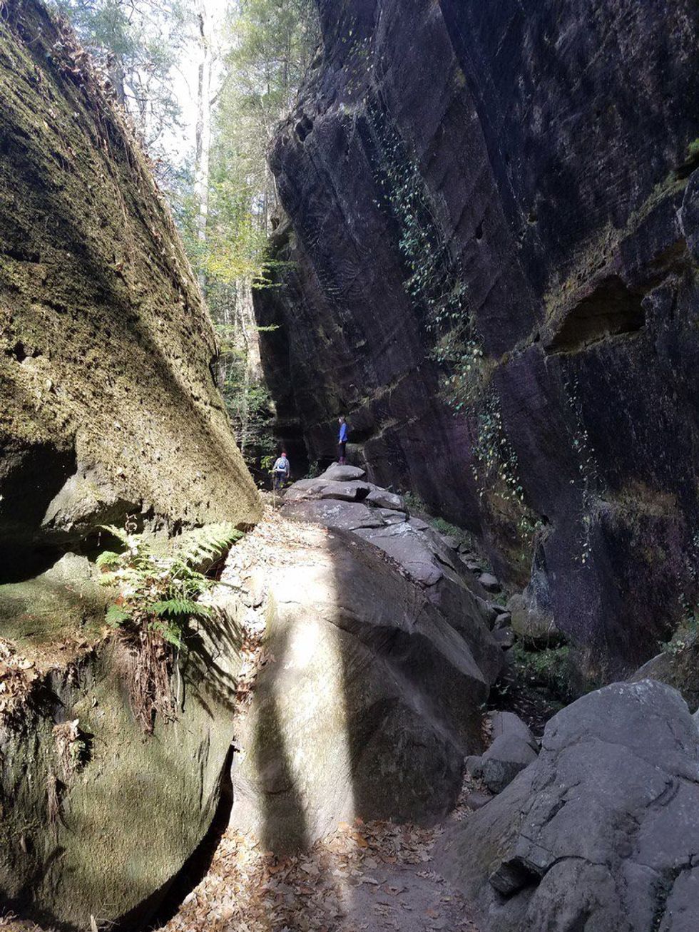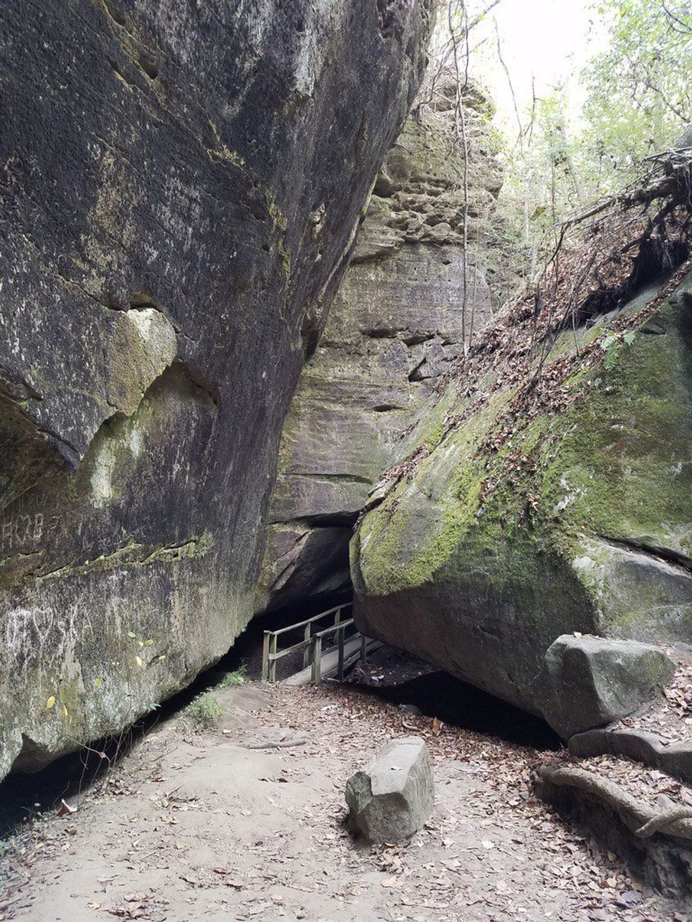 While hiking, you will notice all the beautiful features that Dismals Canyon has to offer. You'll see the enormous boulders and towering trees, not to forget the beautiful deep green grass and moss. The waterfalls and creek add even more wonder to the magical beauty that is Dismals Canyon.
