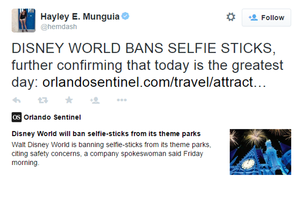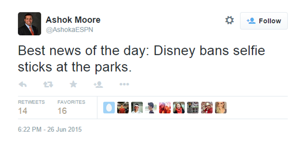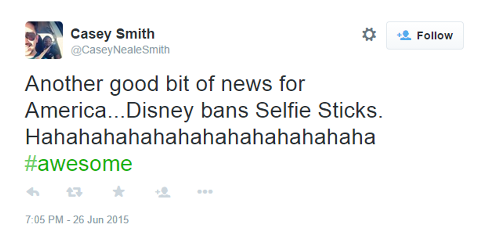 I completely understand Disney's decision to ban selfie sticks in its parks for two reasons. The first reason is that someone could lose their selfie stick on a fast paced ride like Space Mountain or Big Thunder Mountain Railroad. The second reason is that, if the person does lose their selfie stick, the stick could hit a mechanical component to a ride and the ride could do something to either strand or injure (or, even, kill) passengers. Why would someone want to risk his or her life or the lives of others just to take a really nice selfie?