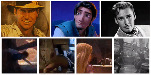 In an interview with Collider, Nathan Greno, one of the directors of "Tangled", said that in creating an "anti-prince" male lead, they sought to create Flynn Rider as a combination of the many great action-adventure stars of the past. He cites Errol Flynn as an inspiration, but also Harrison Ford as Indiana Jones. Theres even a nod to Indiana Jones clips above, when each male hero grabs an item of importance to them at the last minute as they are fleeing danger—Flynn grabs his weapon of choice (a frying pan) and Indiana Jones snatches his signature fedora in "Indiana Jones and the Temple of Doom" (1984).