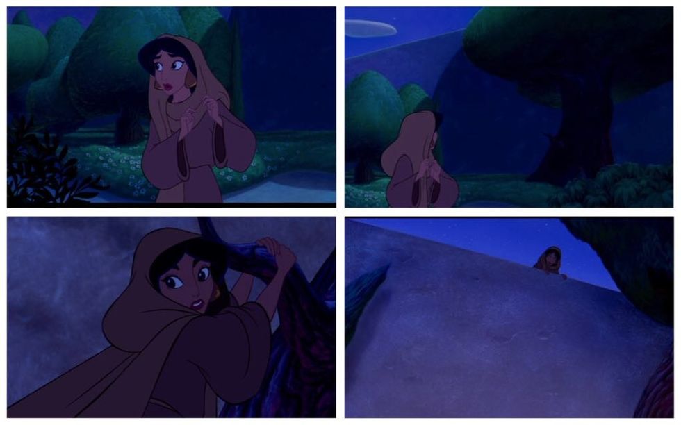 The scenes in which Jasmine sneaks out of the palace grounds and meets Aladdin in the marketplace parallels the plotline of "Roman Holiday". Both Princess Jasmine and Princess Ann seek to escape their lonely, suffocating lives by sneaking out for a day of fun and freedom among "the outside world"—and they both fall in love with the men who help them out in the process.