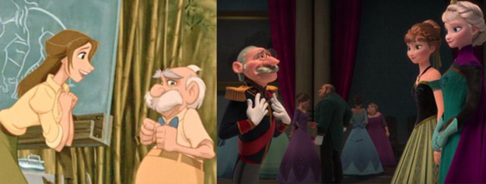 Does that teapot look familiar? This tea-set could be an heirloom that has been passed on to Jane. Also, Jane's dress looks very similar to the gold dress that Belle wears from the iconic dance scene in 'Beauty and the Beast'. Belle didn't have a surname in the movie, so it is possible that her surname could have been Porter, just like Jane's. There is more to this theory that explains the link between the two, and we can sum it up in one word, 'Frozen.' Notice how the Duke from Weselton looks very similar to Jane's father in 'Tarzan.'