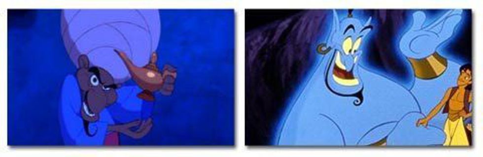 This theory seems to be very popular, but lets look at the clues that make this seem believable. First off, Genie and the merchant are both voiced by Robin Williams (may he rest in peace). Also, the merchant is wearing clothing oddly similar to Genie. The blue robe and beard are a dead giveaway that the two are the same person. Besides that, what other clues make this seem plausible? First off, nothing in the movie ever says that Genie gets to keep his powers after being freed. Also, the scene at the end shows Genie giving Aladdin the lamp (which is basically useless now). Genie shakes Aladdin's hand, then the lamp disappears. But if Genie had the lamp at the end of the movie, how did the merchant get it? Easy, Genie is the merchant, and the entire story of Aladdin is told to try and sell the lamp to the buyer, which in this case is the audience watching.