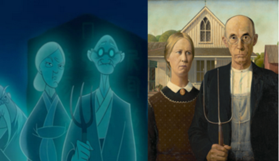 Two of her ancestors are a reference to the famous painting "American Gothic."