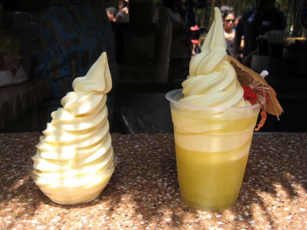 And finally number one. This is not only my favorite snack at Walt Disney World but probably in the entire world. This is a pineapple ice-cream that you can either eat on its own or float-style with pineapple juice. I would recommend this to everyone, no matter if you like pineapple or not you have to at least try it. I only know one person who doesn't like Dole Whip and I've decided it is best if I stop trusting them all together.
