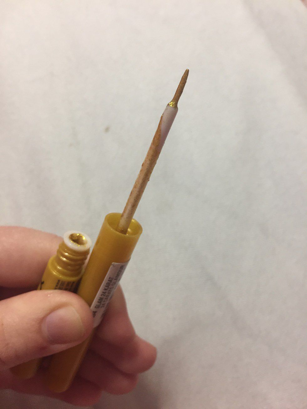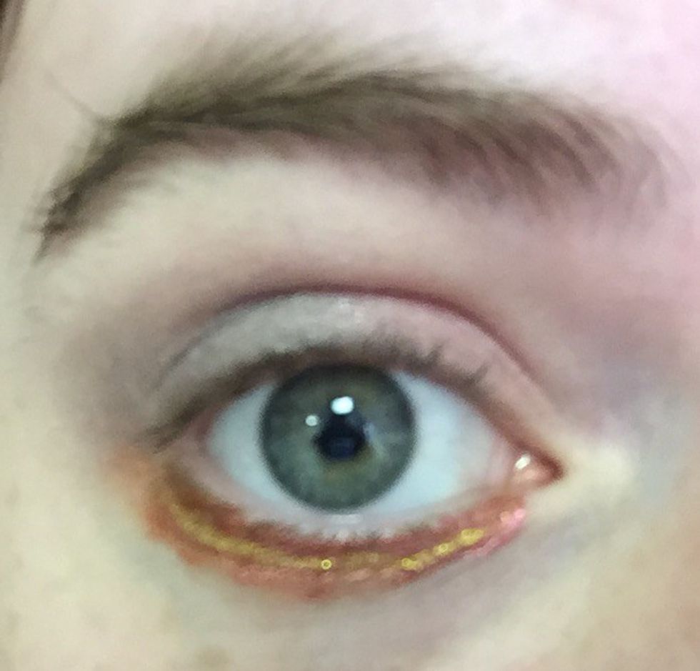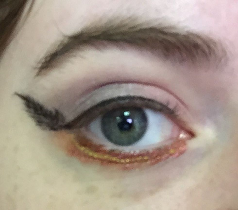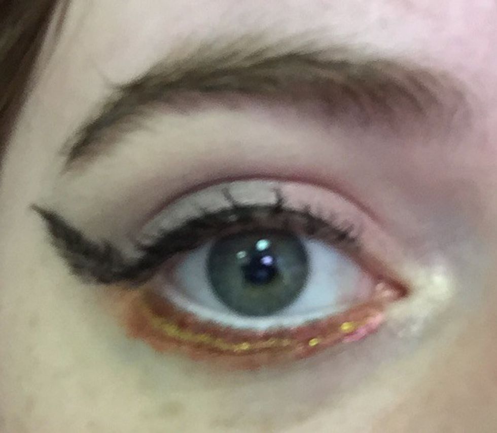 Using a red liquid or gel eyeliner, draw a squiggly line right on the lower lashline, then follow that line with a yellow or gold liner, followed by the same red one. If some of the product transfers from the first line, it can be easily fixed by drawing the line over it. Fill in any small gaps with a matching eyeshadow on an angled or pencil brush.