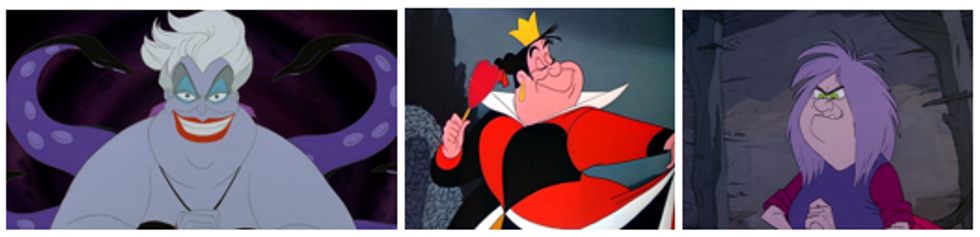 Ugly + Fat Women: Ursula (conman and attempted murderer), Queen of Hearts (murderer) and Madam Mim (attempted murderer).