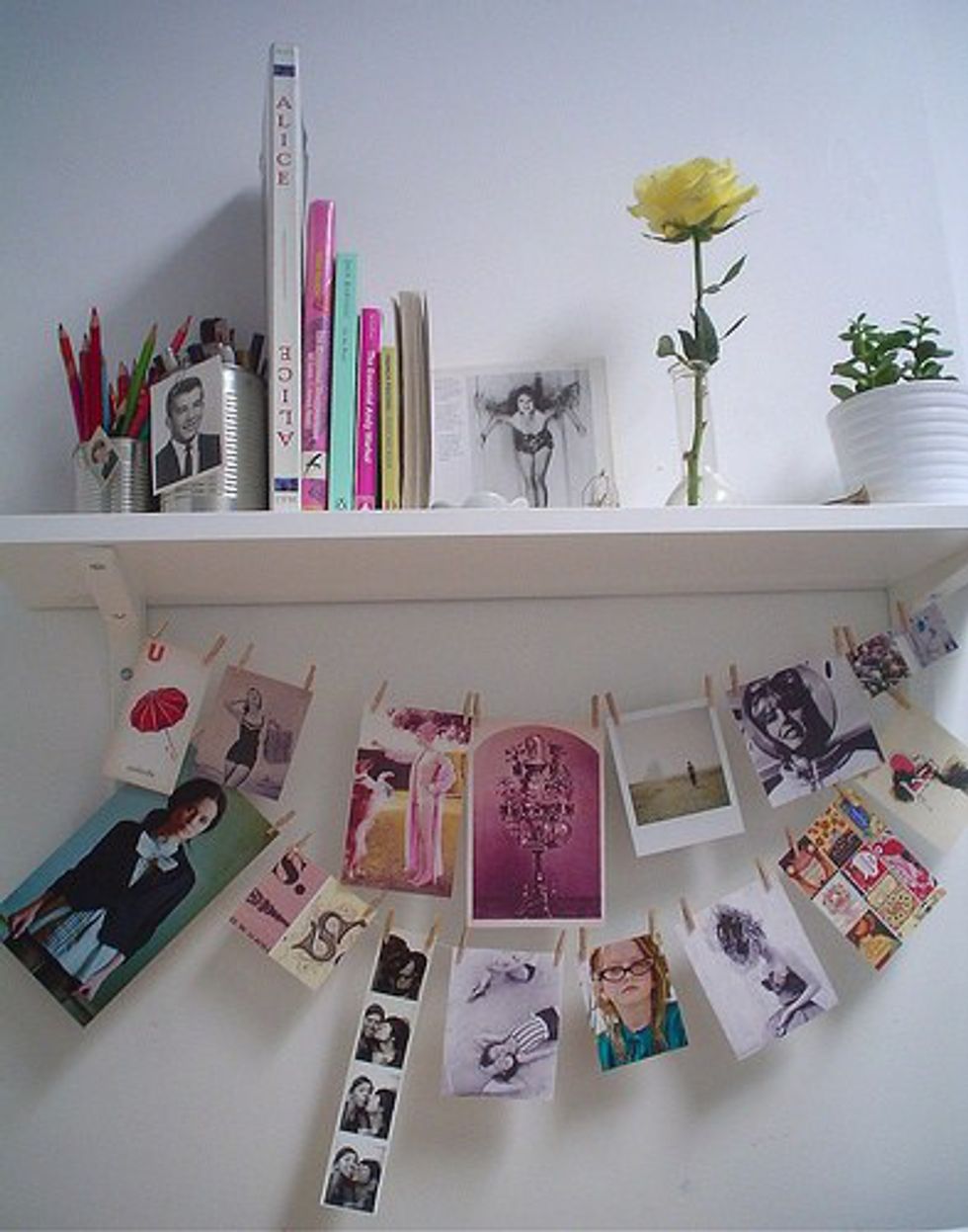 This idea is great for filling that awkward space below shelves. It uses clothesline and mini clothespins to hang smaller picture. I think it could be utilized below a lofted bed, or many other locations as well.