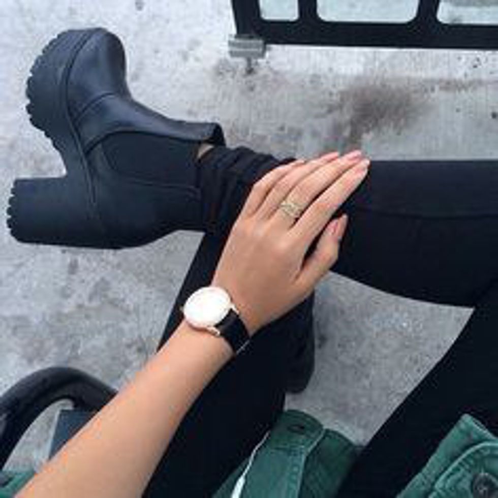 In terms of shoes, Londoners wear Chelsea platform boots, platform sandals, and various shoes that are in guess what color ... ALL BLACK.