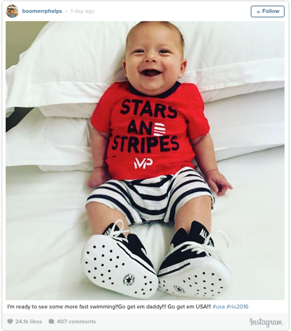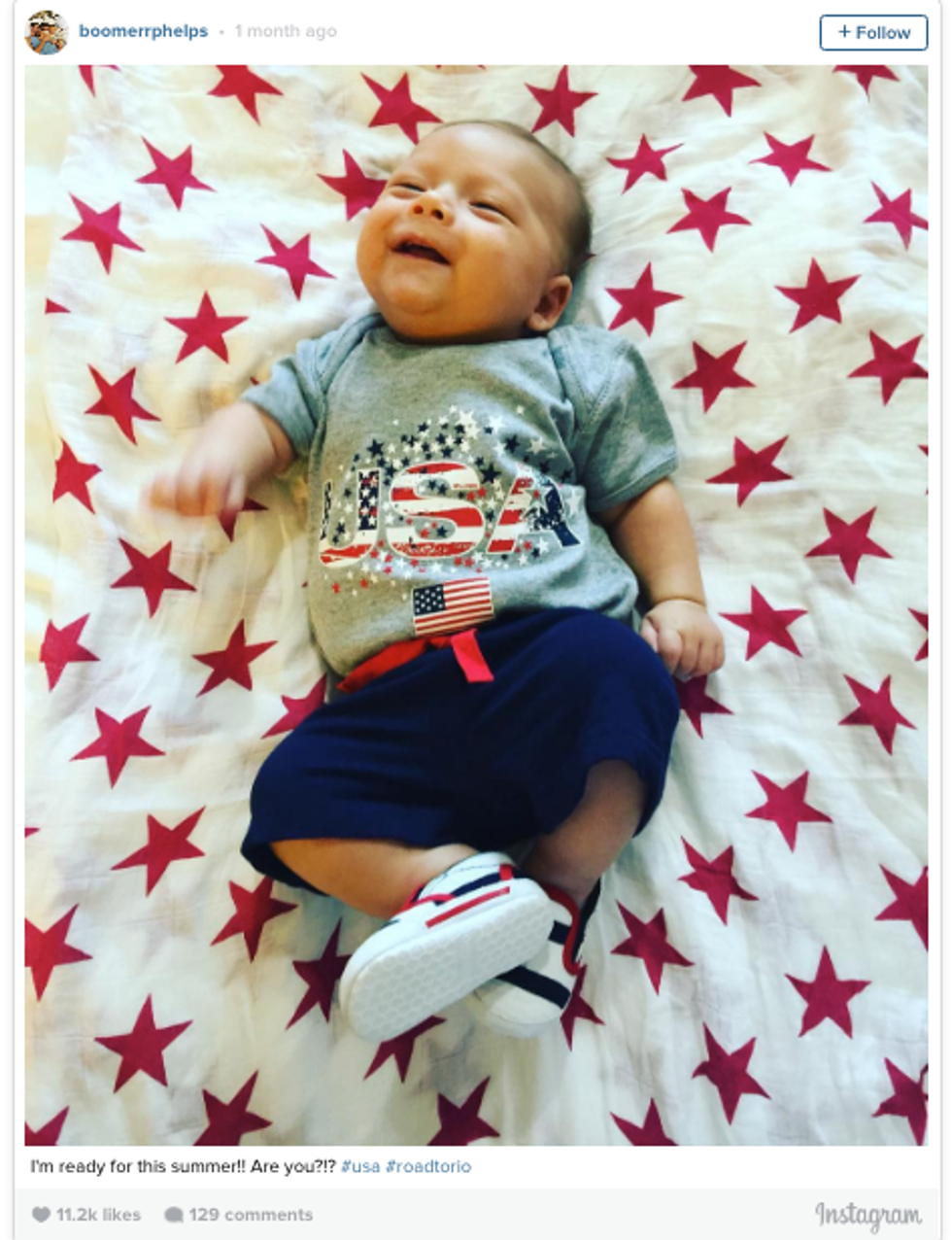 All eyes should have been on Michael Sunday at the Olympic men's 400m relay qualifiers, but there was another guy who caught our eye instead: Boomer Phelps, Michael's 3-month-old son. Decked out in his patriotic colors, little Boomer rooted so hard for his dad he feel asleep before the race was over!