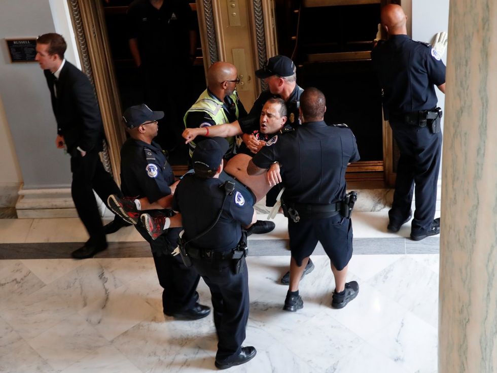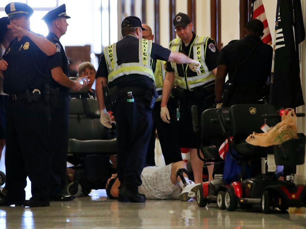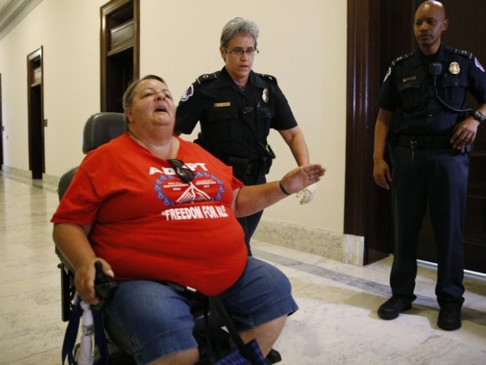 Following the draft of the bill being released on Thursday, ADAPT, a national disability rights organization organized a protest outside over the a Senate health care bill outside of Senate Majority Leader Mitch McConnell's office. The protesters yelled chants like "don't touch Medicaid, save our liberty." Capitol police reported that they arrested 43 people for refusing to end their protest. Some of the protesters removed themselves from their wheelchairs as a sign of their "die-in" demonstration.