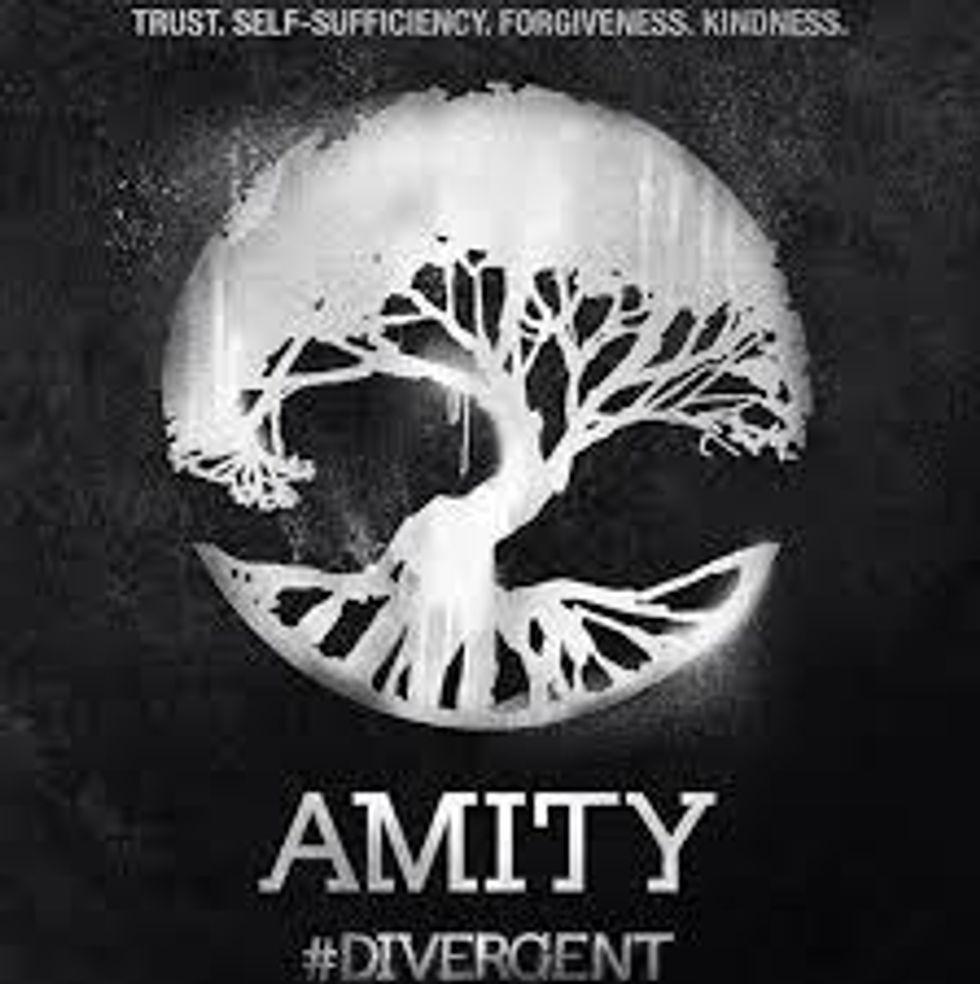 Amity. Happy, loving, singing and sunshine. Bright, warm colors represent their loving, happy, peaceful environment. In charge of the farms just beyond the fence, Amity grows crops and raise live-stock. The tree represents their connection to the Earth and their role as food providers for the factions.