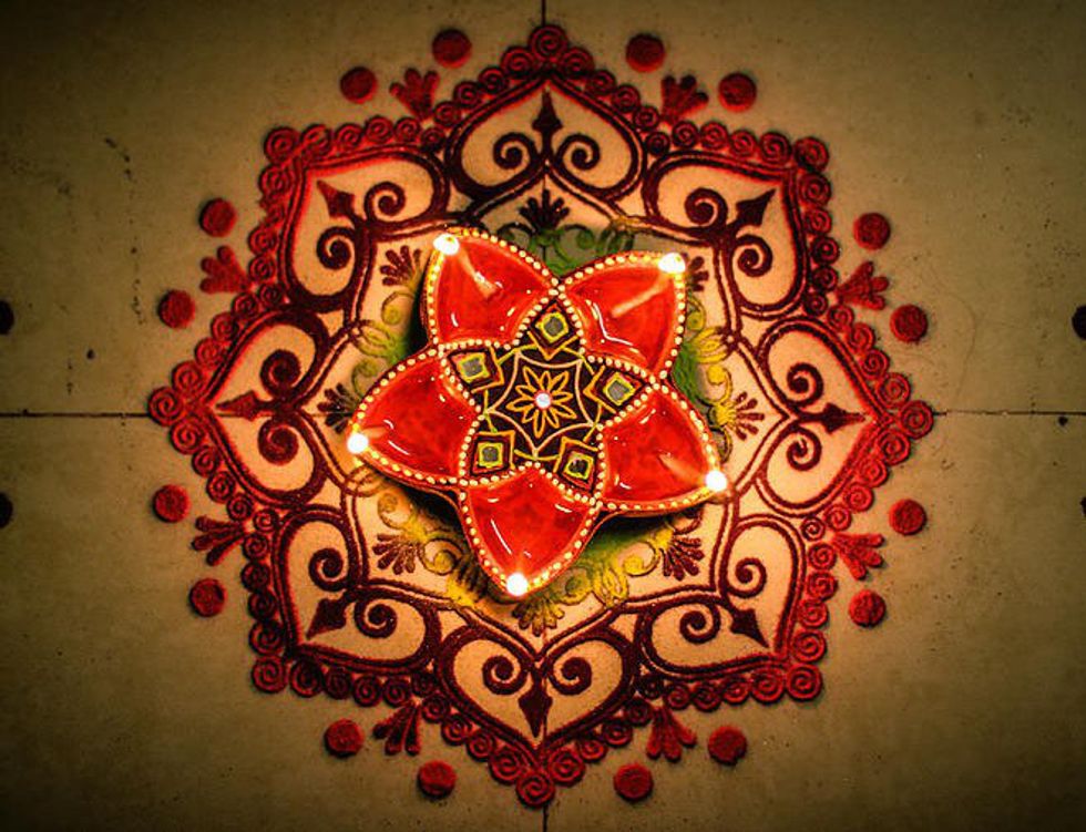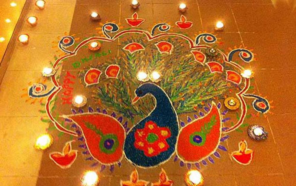 During Diwali, people tend to decorate rangolis in their houses. Rangolis are typically flower-like designs that are formed from flower petals and sand. Then, lights are adorned around the rangoli to show the theme of the festival.