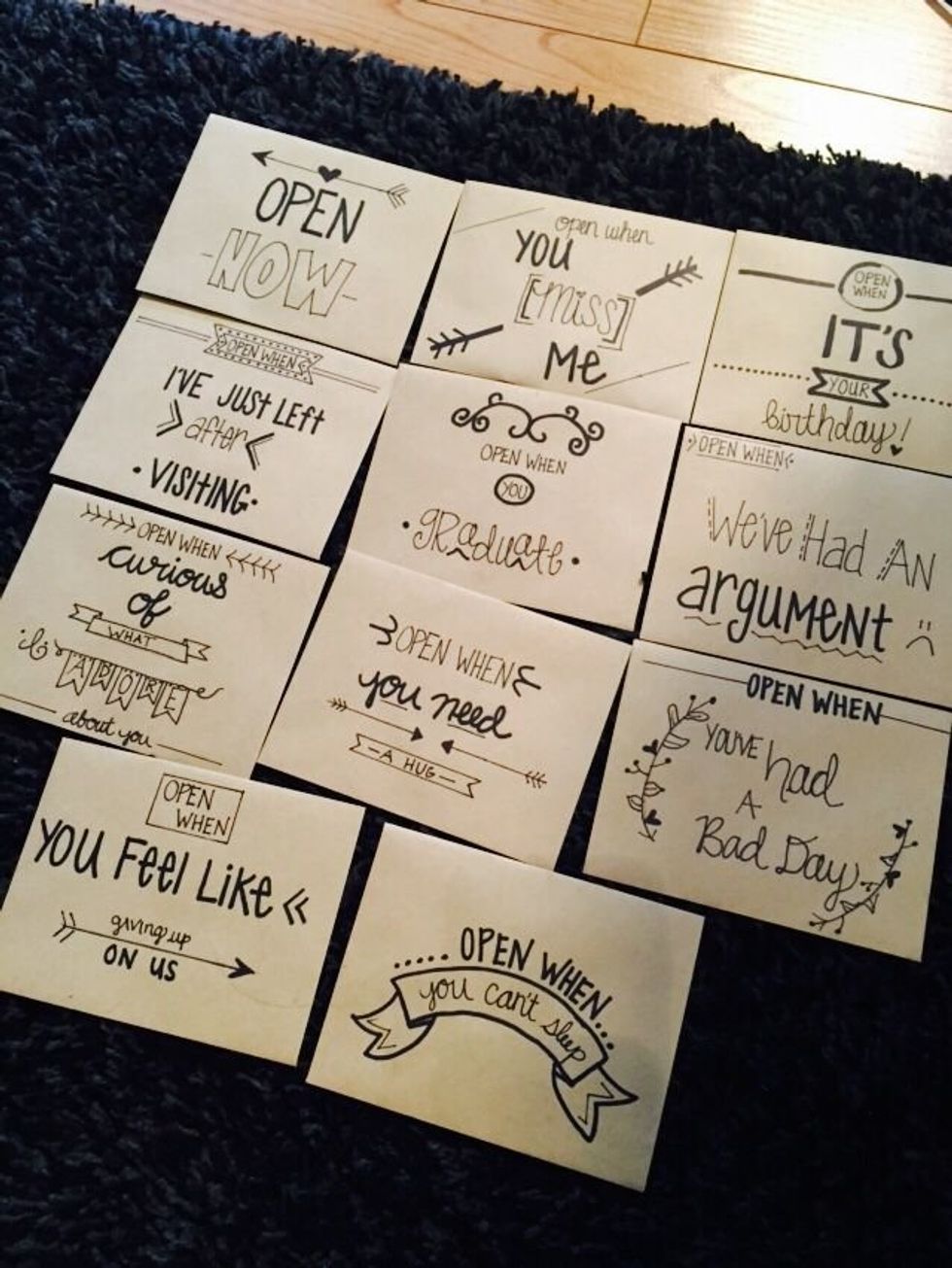 "Open when you're having a bad day," "open when you miss me," "open when you need some inspiration"—the list goes on. Writing your boyfriend or girlfriend a set of letters is thoughtful, romantic and a gift that keeps on giving. If you're in a long distance relationship, this is perfect for you!