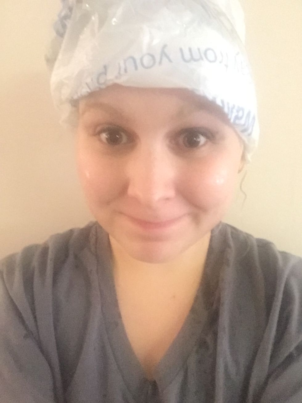 Consider it done, Katie. Amazingly these were all things I already had in my house, so that made this a lot easier (and cheaper). It said to saturate hair so I most certainly did, I have pretty long hair and this was just enough mixture to cover my hair. The only thing I didn’t have was a shower cap, so I just used a supermarket plastic bag because for some reason I have 10,000 of them stored up and it’s the same thing as a shower cap. Basically, I’m recycling, you’re welcome, environment.